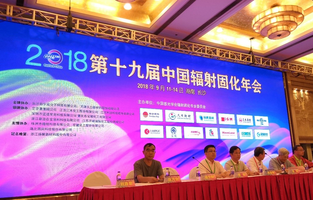 2018年9月11日,第十九屆中國輻射固化年會在長沙召開。揚帆新材董事長樊彬、總裁李耀土以及副總裁朱俊飛、技術總監吳紅輝等出席會議。