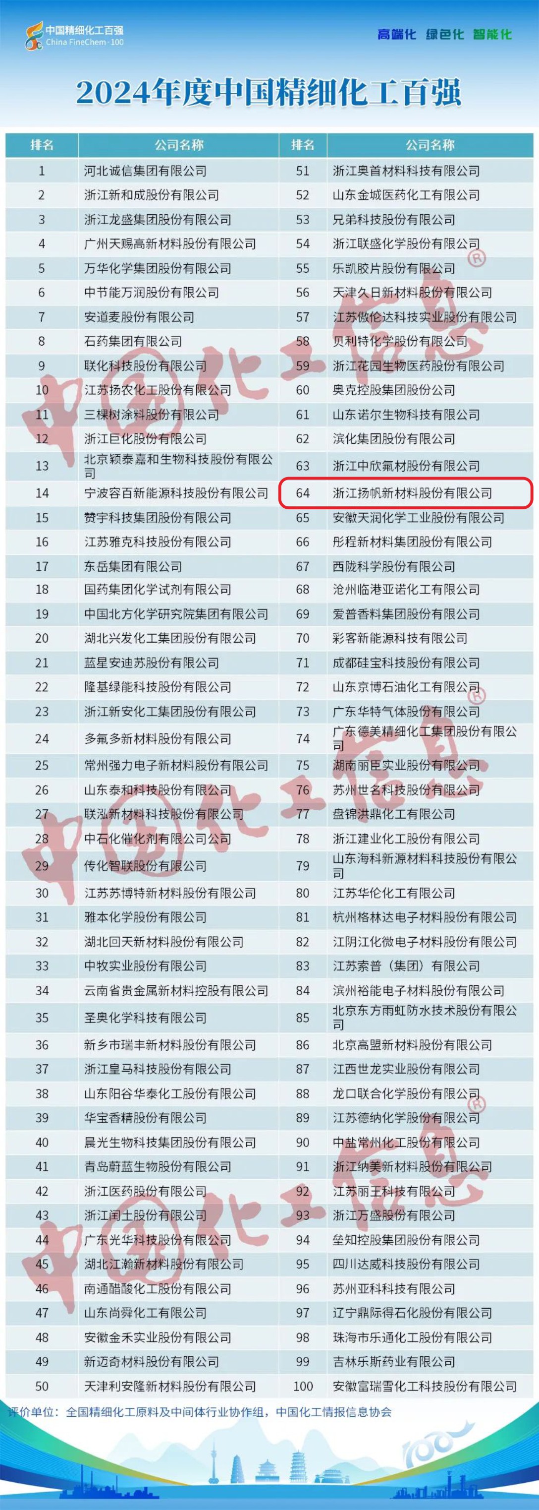 浙江揚帆新材料股份有限公司再度榮登“中國精細化工百強”,位居第64位,排名較去年上升9位。